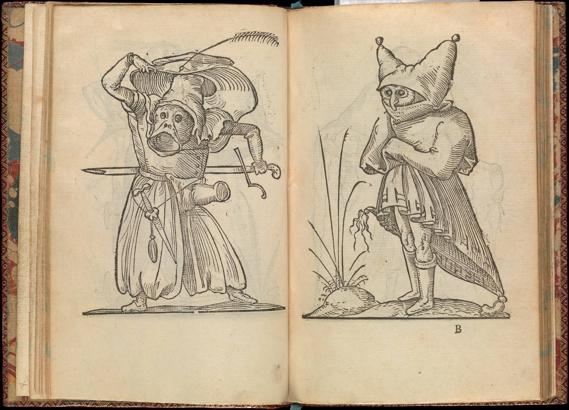 The woodcuts present a hodgepodge procession of absurd figures with incongruous bodies, both ludicrous and disturbing. Some are draped in ecclesiastical garb with broad brimmed hats and ghastly flowing robes that exaggerate authority. Some parade about in makeshift armour with ostentatious spurs and weaponry, signaling aristocratic lineage. Others flaunt musical instruments or prolific codpieces like crude overcompensation for lacking masculine virtues. Among them, a figure clad in a cardinal’s cassock casts a book into the depths of a well, suggesting censorship. There is often no clear delineation between where one thing begins and another ends, whether human or beast, anatomy or object. The grotesque beings mimic and mock their way through a world turned upside down in a parody of power.
