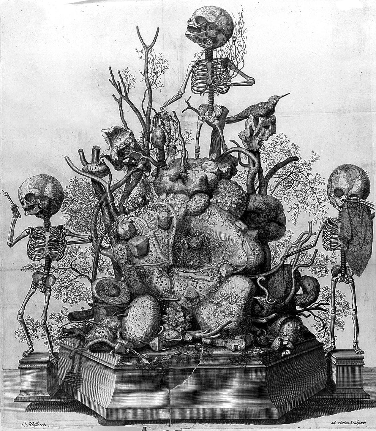 Intaglio by Frederik Ruysch, ‘Thesaurus anatomicus; skeleton monument’ (1701–1716)